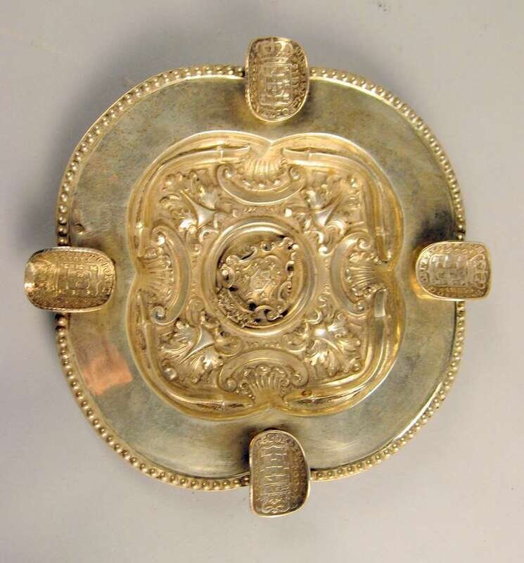 Of quatrefoil form with a beaded edge and mounted with coins, the center in high foliate relief and mounted with an heradlic shield, stamped 800.