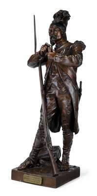 Bronze, medium brown patina, modeled as a soldier lighting a pipe, his rifle by his side, raised on a square base.