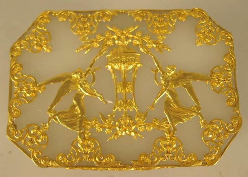 Of casket form with pierced overlay of classical figures and floral garlands raised on paw feet.