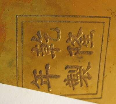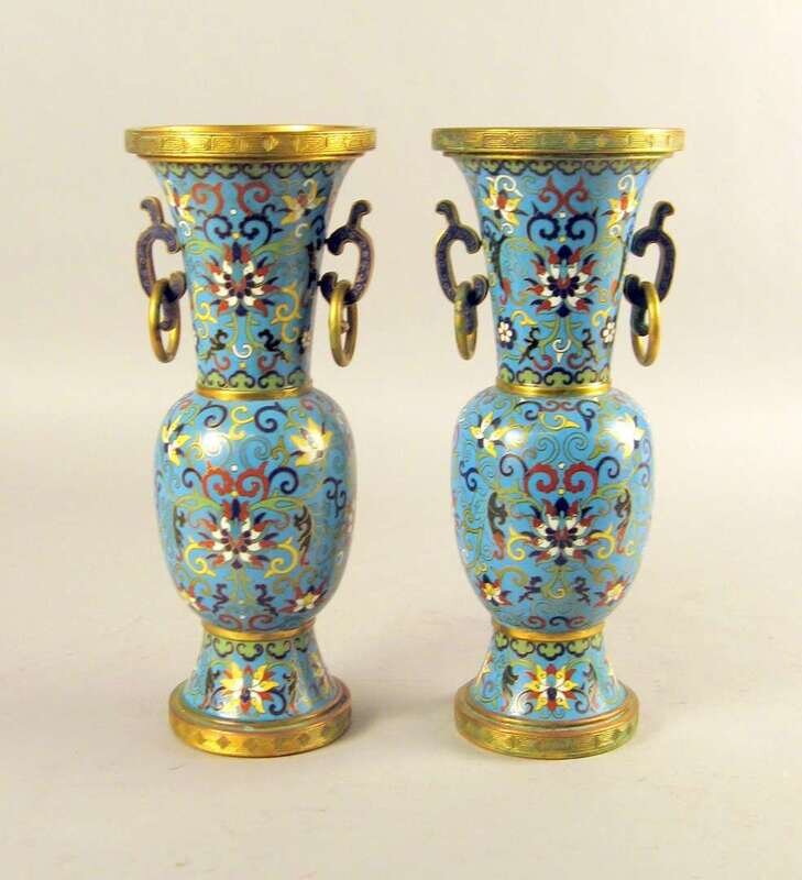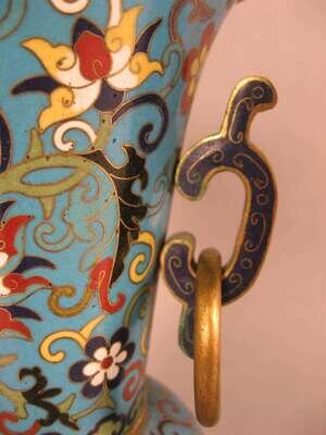 Of gu form, gilt metal mounted blue ground enameled with Indian Lotus flowers over a Roman Key band. (2).