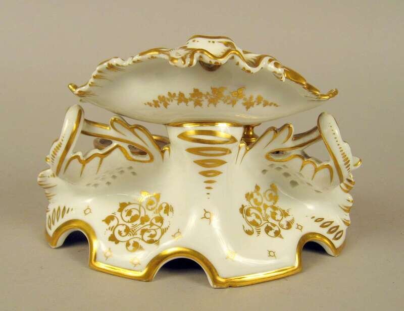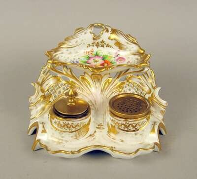 With a shaped scroll base painted with floral sprigs and gilt accents, holding a sandpot and inkpot.