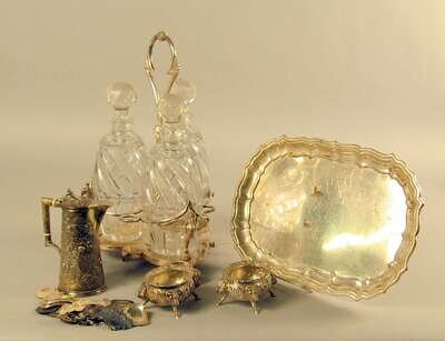 Comprising a Reed & Barton sterling silver tray, a Kirk & Sons cream jug, a pair of Hardy & Hayes sterling silver salts, a silverplate three bottle decanter set, and an assortment of sterling silver decanter labels.