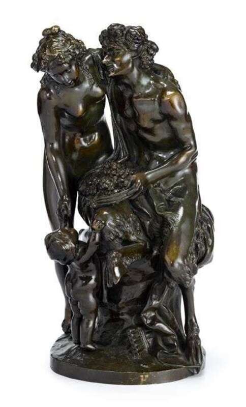 Bronze, dark brown patina, modeled as a bacchante and satyr with a child.
