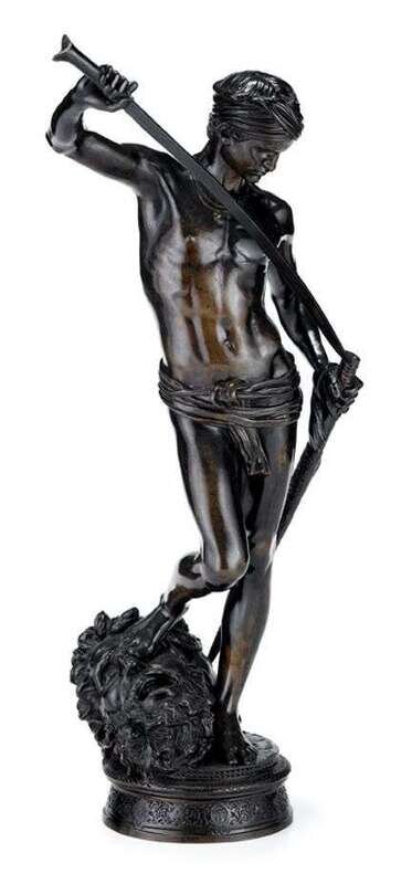 Bronze, dark brown patina, modeled as a semi-nude figure sheathing his sword, his foot resting on Goliath's head, raised on a cast circular base, inscribed 'A. Mercie'.