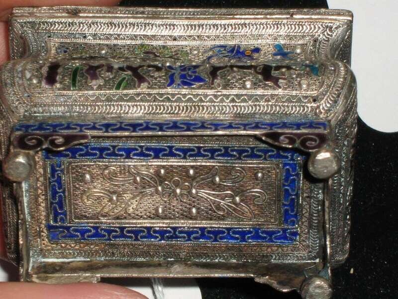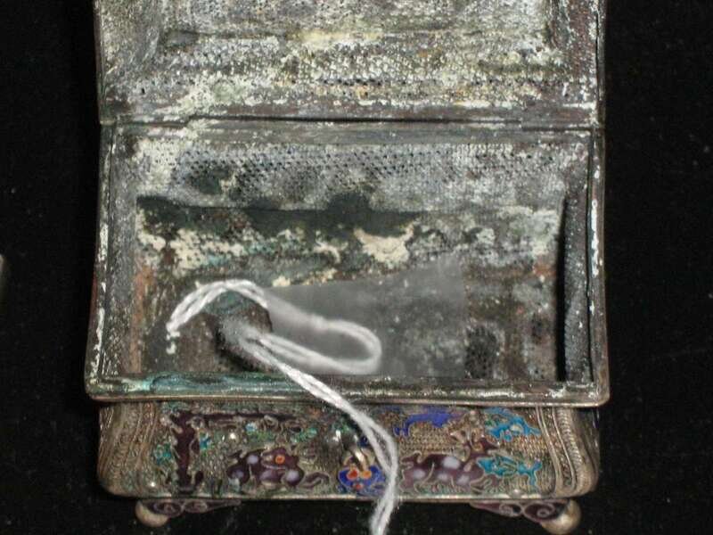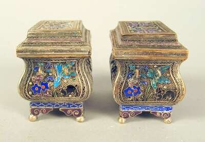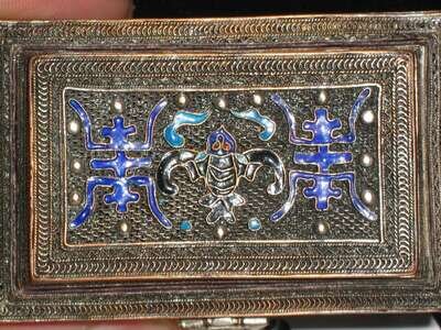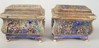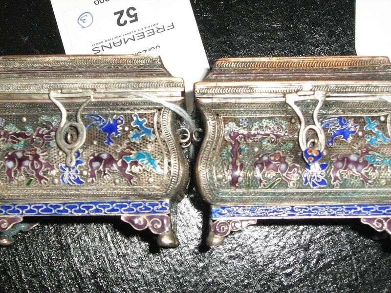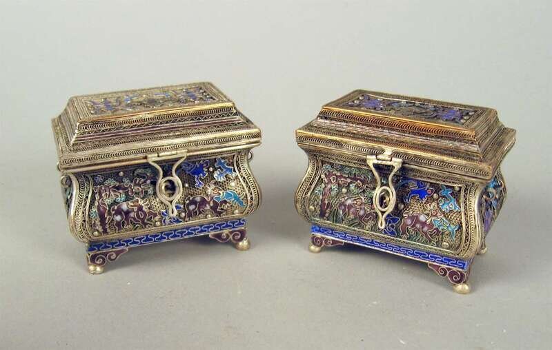 Comprising a rectangular cigarette case with bamboo, and two filigree pill boxes of casket form enameled with exotic motifs. (3).