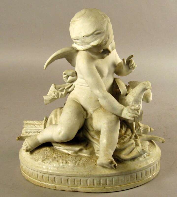 Modeled seated beside a quiver of arrows and a dove, on a shaped oval base.
