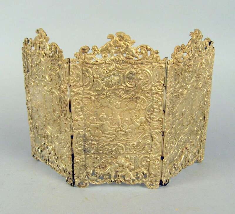 With three panels, each with pierced cresting and repousse scenes of putti, unmarked.
