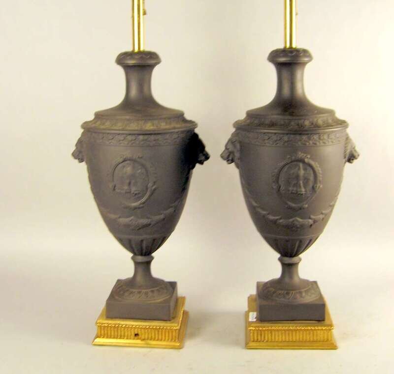 Basalt style, with molded lions' mask handles and relief classical reserves, on a square marble base. (2).