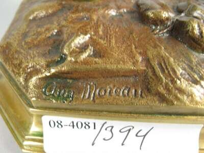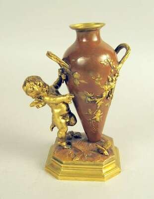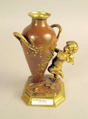 The first example a French baluster vase flanked by a putto, on a square base; the other a covered dish with berry finial and decorated in relief with classical figures and angels. (2).