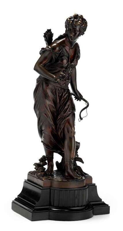 Bronze, dark brown patina, modeled as a standing woman with a bow in her hand and a quiver of arrows on her back, signed 'Bouret' raised on a a shaped slate base.