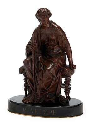 Orange brown patina, modeled as a woman seated on a bench, a walking stick in her hand and a quiver of arrows by her feet, raised on an oval black marble base inscribed 'PENELOPE'.