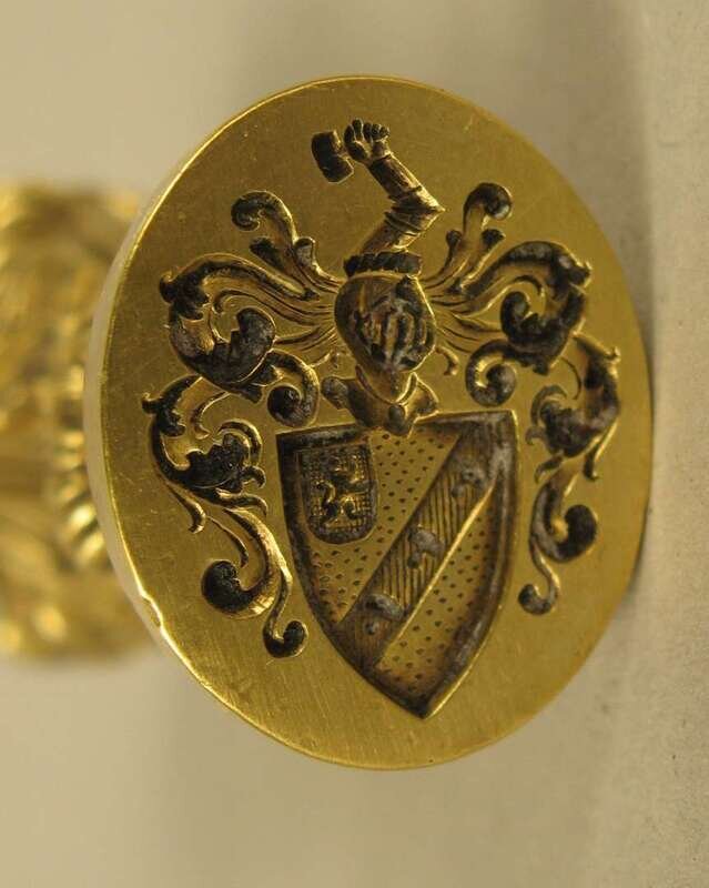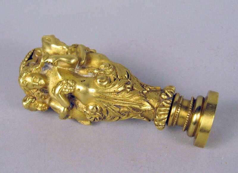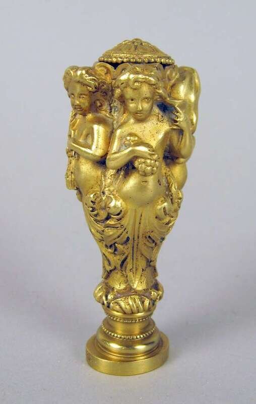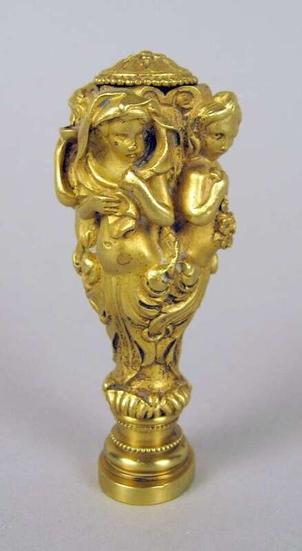 The handle cast with female terms, the seal engraved with a heraldic shield.