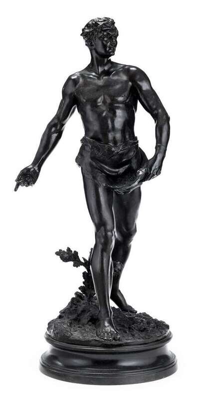Bronze, dark brown patina, modeled as a semi-nude man sowing seeds, raised on a circular base, inscribed 'Gaudez'.