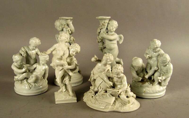 Comprising two KPM blanc de chine figure groups of putti, three bisque figure groups of cherubs, and a pair of Capodimonte bisque candlesticks signed 'Boizot'. (7).