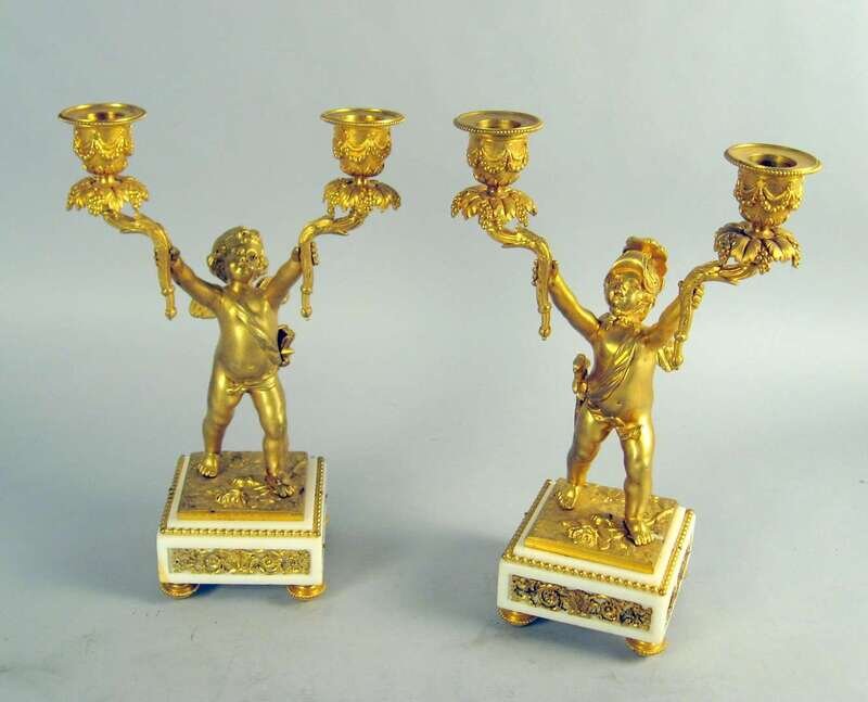 Each stem in the form of putti holding a pair of candlearms, raised on a square white marble mounted base, raised on pad feet.