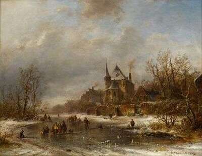 ADOLF STADEMANN (GERMAN 1824-1895) SKATERS ON A FROZEN RIVER
