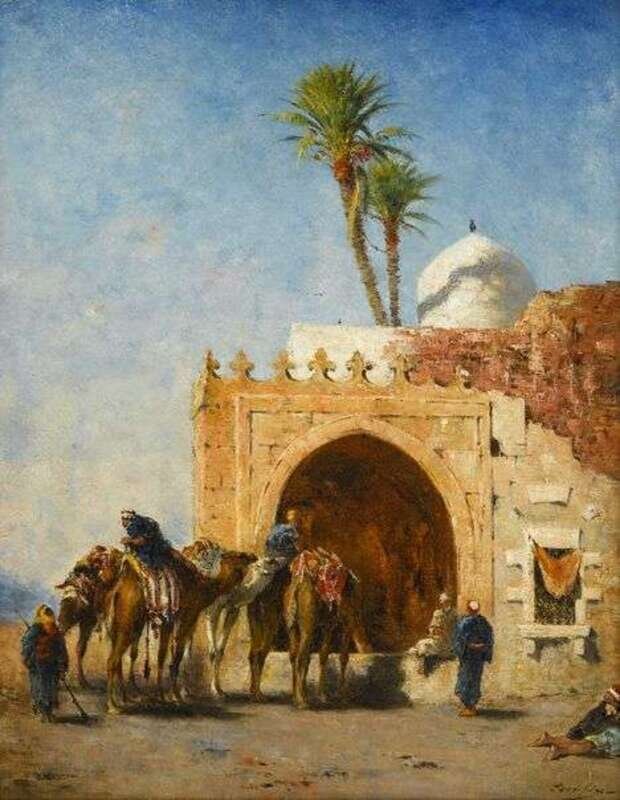 NARCISSE BERCHERE (FRENCH 1819-1891) A TROOP OF CAMELS WATERING