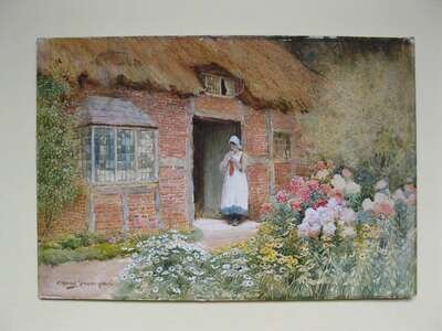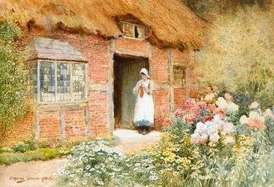 ARTHUR CLAUDE STRACHAN (BRITISH 1865-1932) "KNITTING AT THE COTTAGE DOOR"