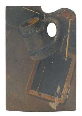 JOHN FREDERICK PETO (AMERICAN 1854-1907) STILL LIFE WITH MUG AND CHALK BOARD