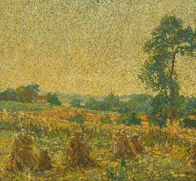CARL WUERMER (AMERICAN 1900-1982) HAY RICKS IN A WOODED LANDSCAPE