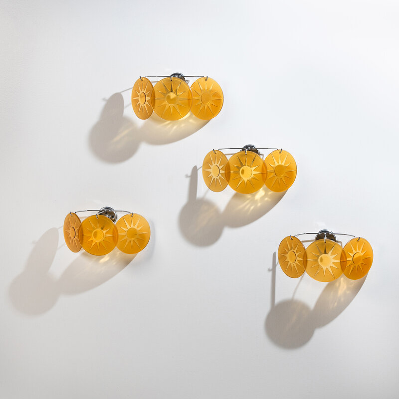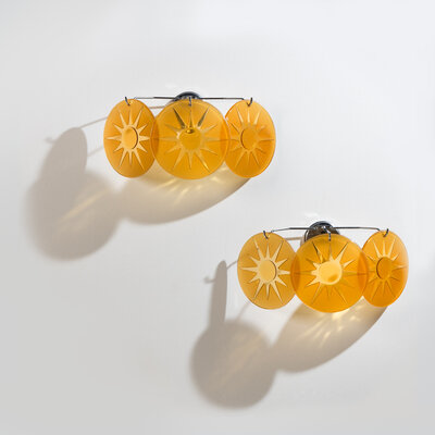 Group of Four Amber Glass Three-Light Wall Sconces