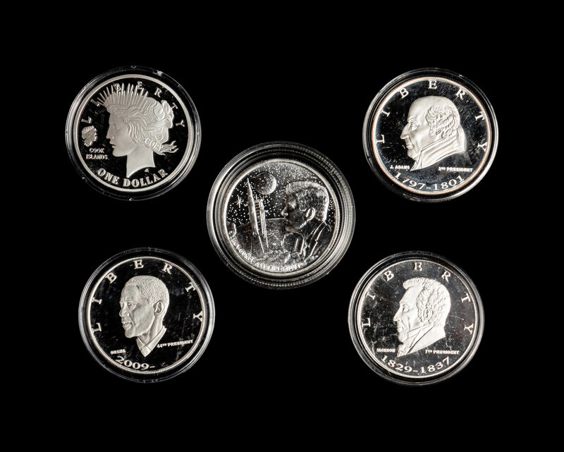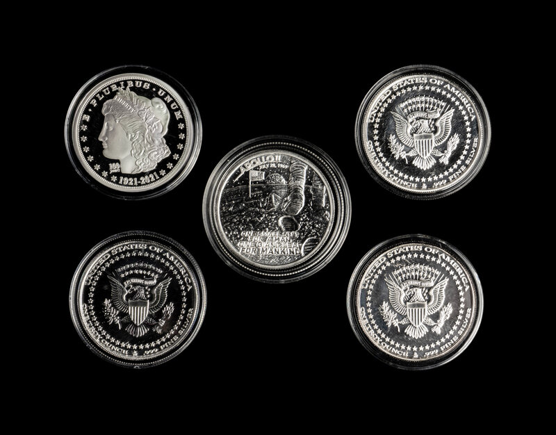 of varying design and weights ranging from 1/10 ozt. to 16 Avoirdupois oz, approximately 430 ozt total.