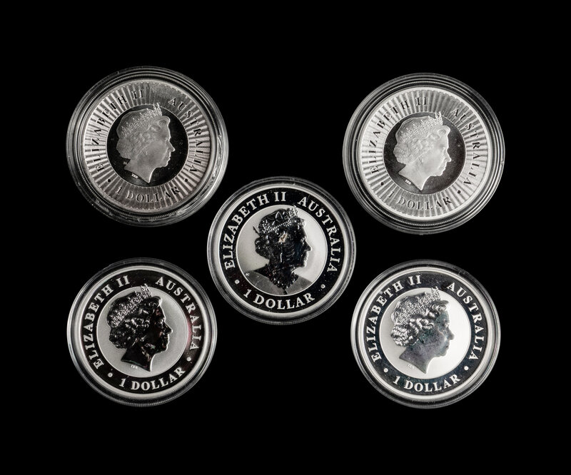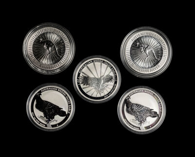 1/2 oz. Wedge Tailed Eagle (x56), Kookaburra 1 oz. $1 (x3), Kangaroo 1 oz. $1 (x8), Wedge-Tailed Eagle 1 oz. $1 (x42), Lunar New Year 1 oz. $1 (x3), Salt Water Crocodile 1 oz. $1 (x4), 2018 Year of the Dog 2 oz. $2, 2019 Apollo 11: Moon Landing Commemorative 1 oz. $1 (x2);