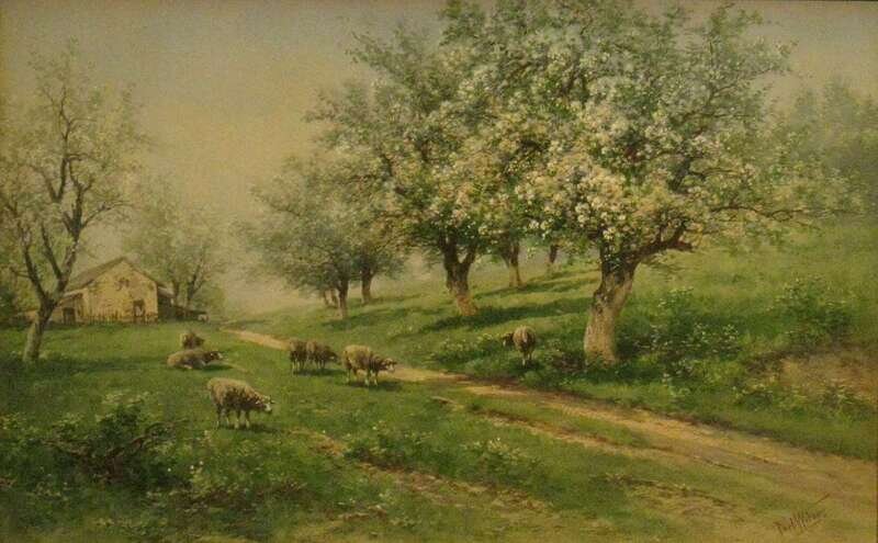 CARL WEBER (AMERICAN, 1850 - 1921) SPRING LANDSCAPE WITH SHEEP AND COUNTRY HOUSE
