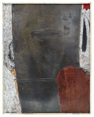 Signed, dated and inscribed 'Kalinowski '69 N.Y.' bottom right and titled ' "OISEAU AVEUGLE" ' bottom left, oil, fabric and leather assemblage