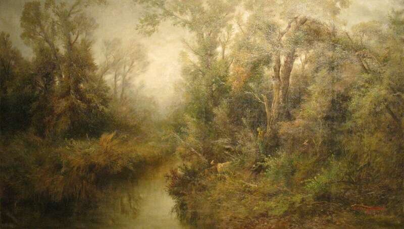 JOHN EDMUND CALIFANO (AMERICAN, 1862-1946) LANDSCAPE WITH GOATS AND SHEPHARDESS