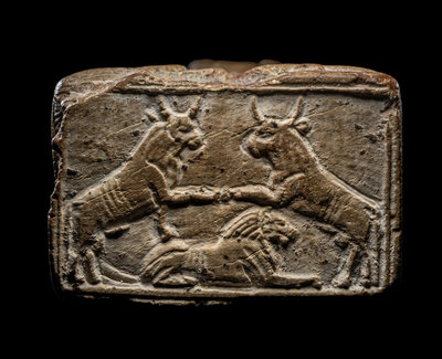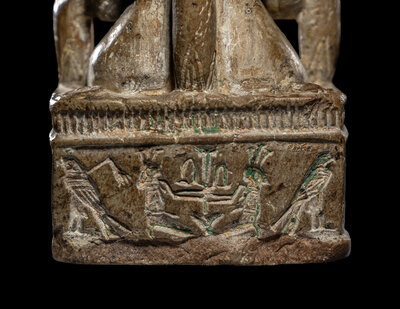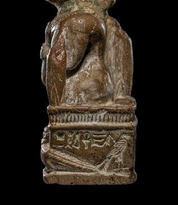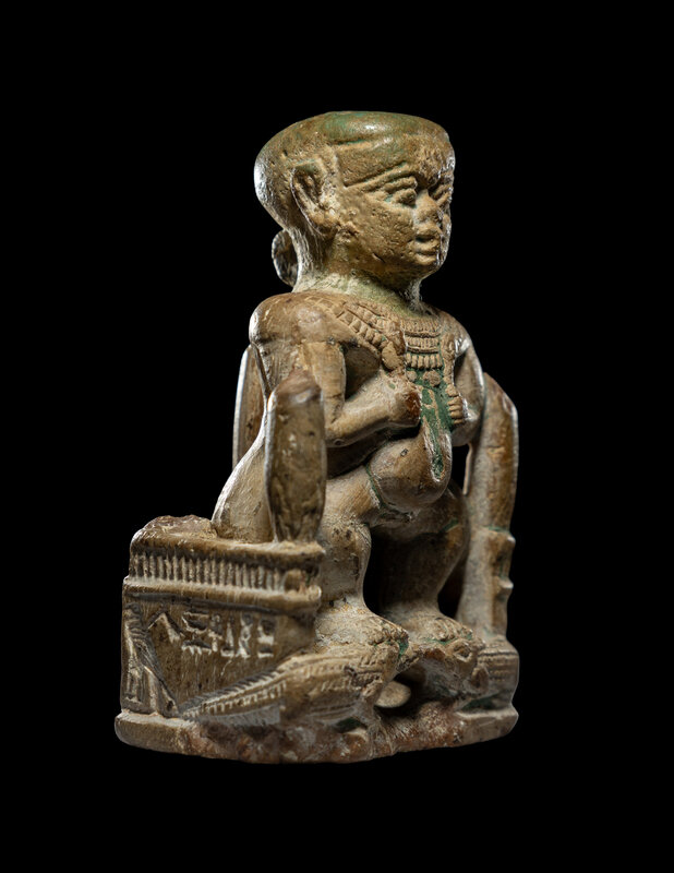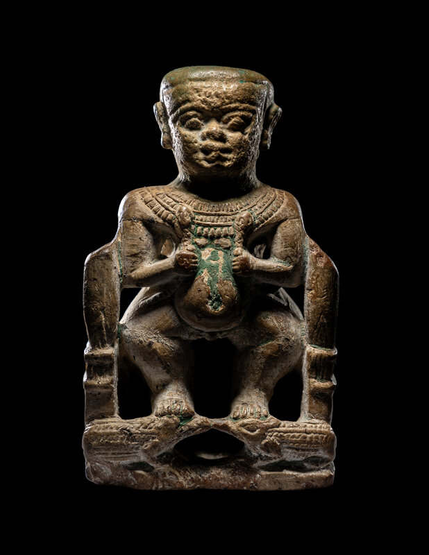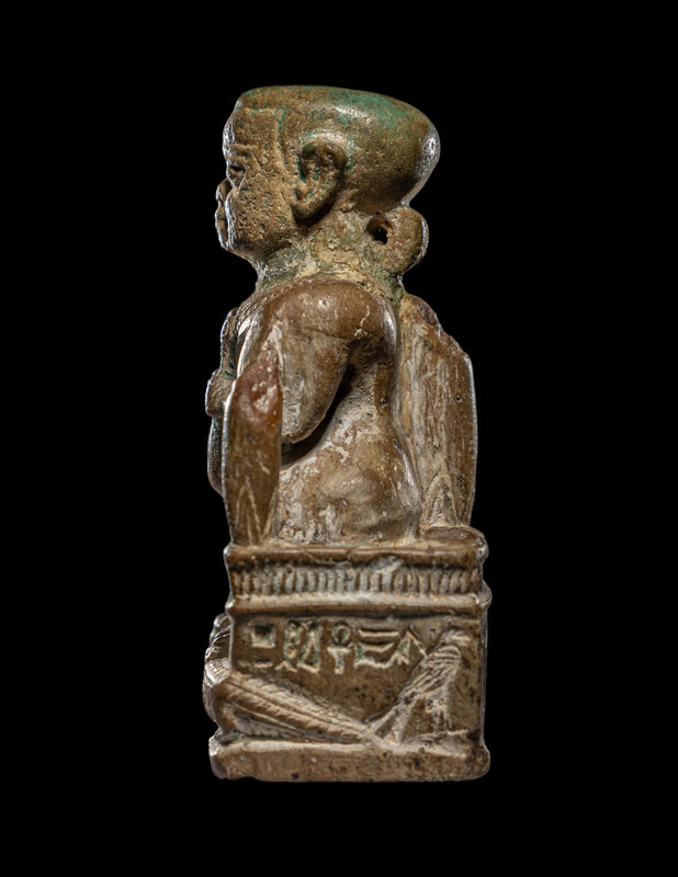 An Egyptian Glazed Steatite Amulet of Pataikos on Crocodiles