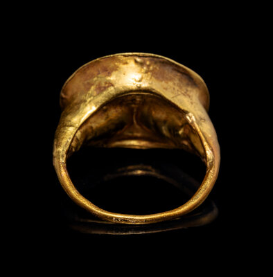 Ring size 5; Height 7/8 inch (2.22 cm); High karat gold; 2.67 dwt.