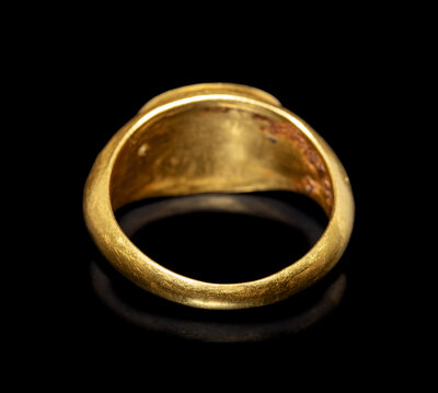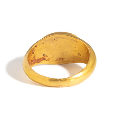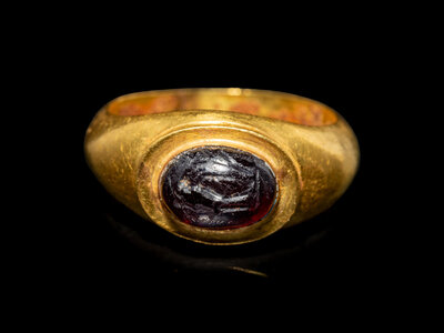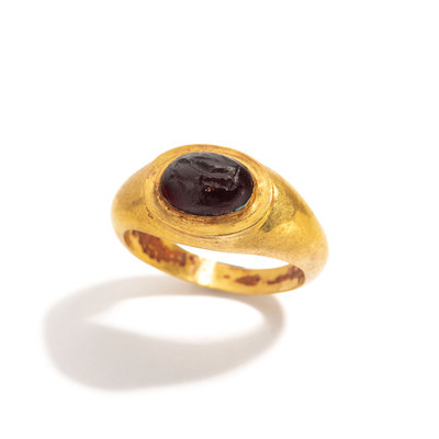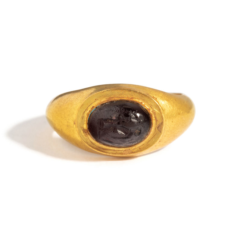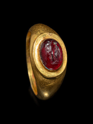 A Roman Gold and Garnet Finger Ring with the Goddesses Athena and Nike