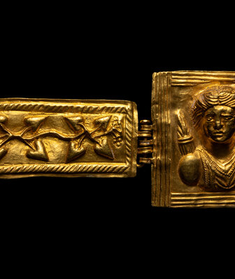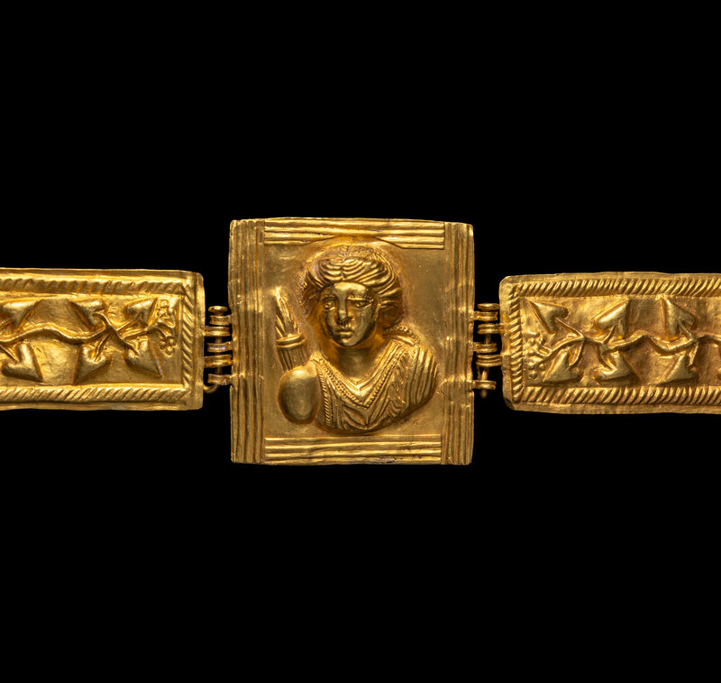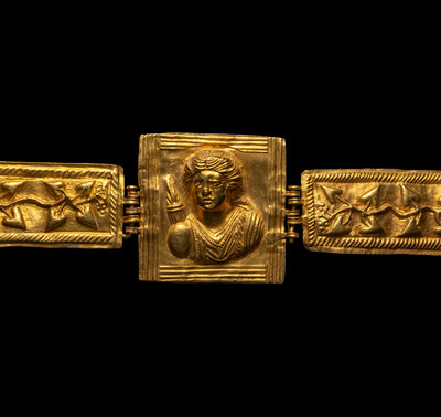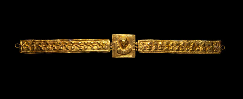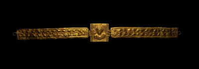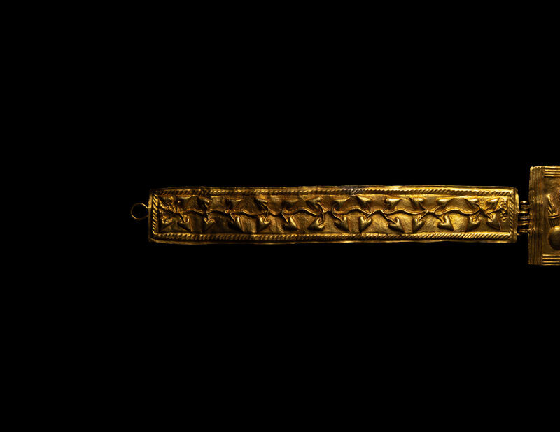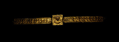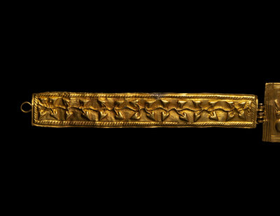 Width 19 1/4 inches (48.9 cm); High karat gold; 85.4 dwt.