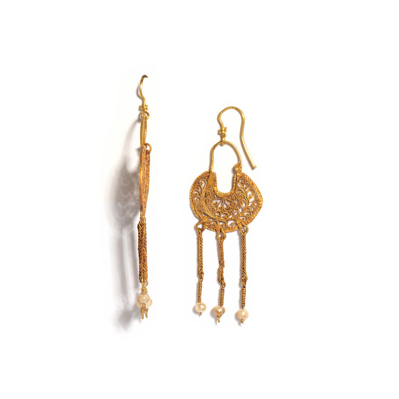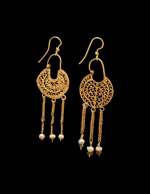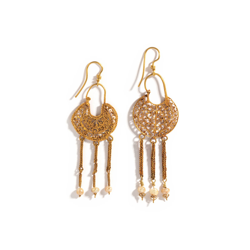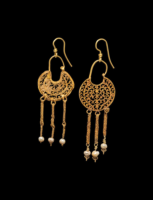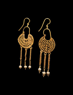 A Pair of Byzantine Gold and Pearl Openwork Earrings