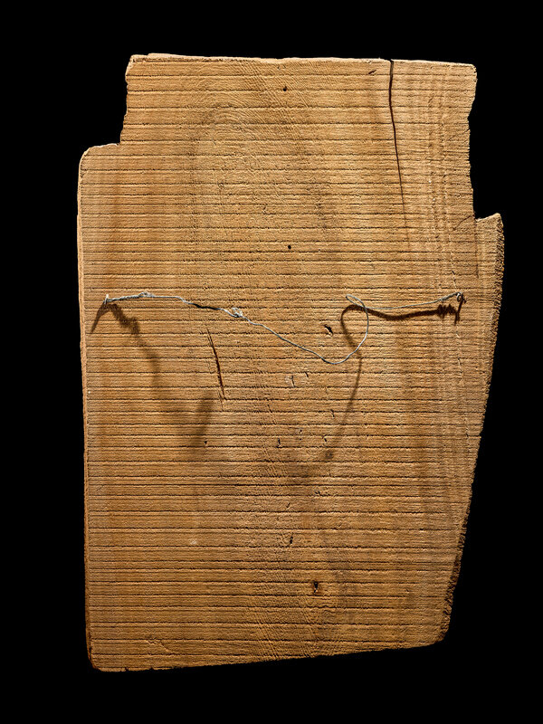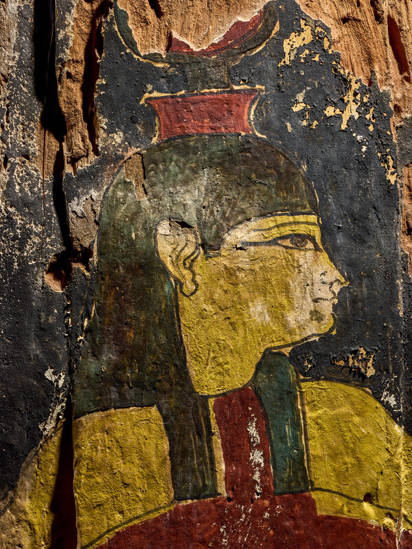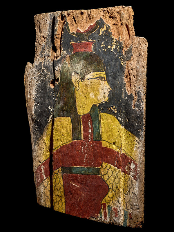 An Egyptian Painted Wood Sarcophagus Fragment with Isis