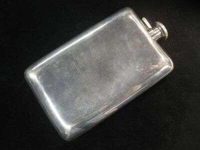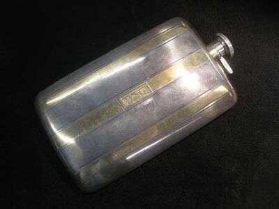 Over-sized sterling flask, with yellow gold stripe, etched 'GWP'.