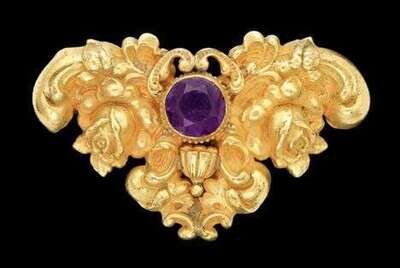 Floral hammered yellow gold brooch set with a single round cut amethyst.