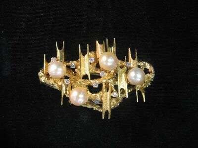 14 karat yellow gold diamond and pearl brooch 1960s