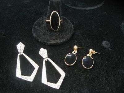 Onyx disk ring and earrings set, together with a pair of yellow gold and diamond ear pendants. For pierced ears.
