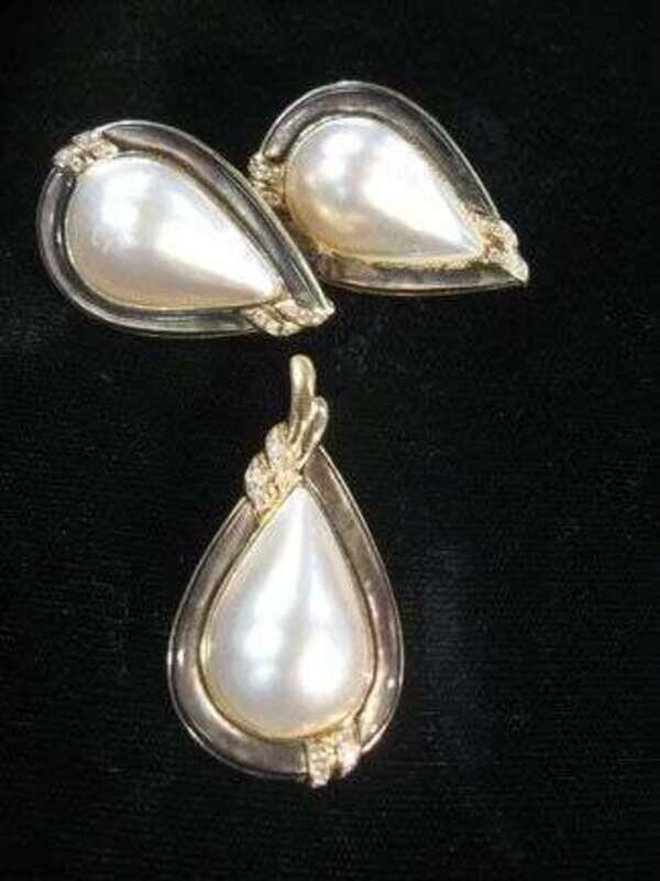 14 karat yellow gold mabe pearl earrings and pendant