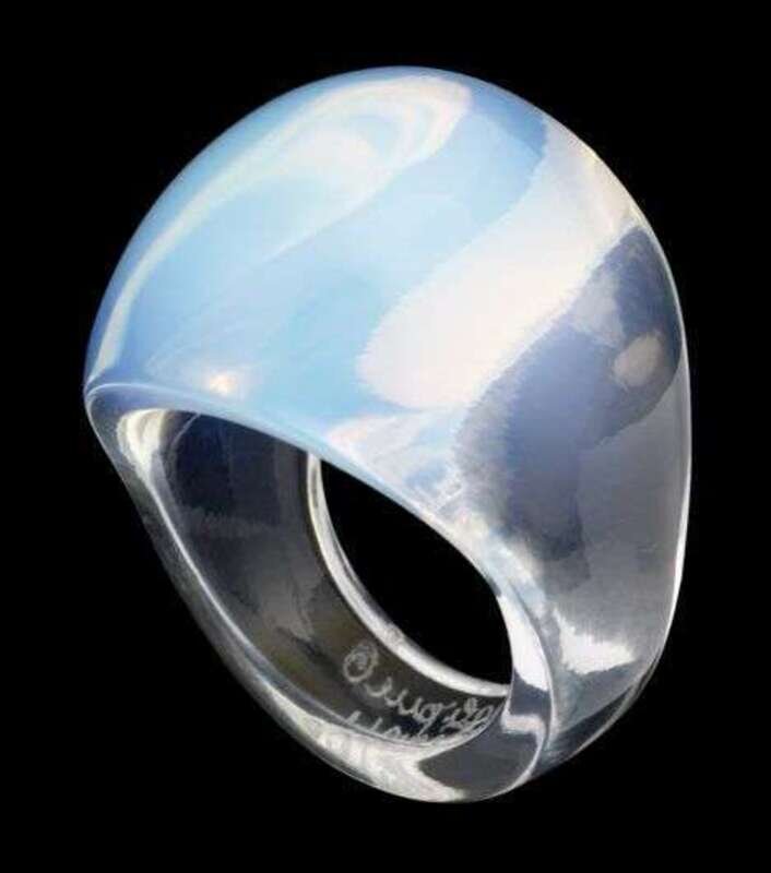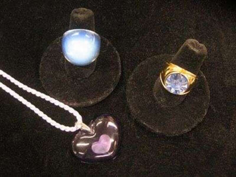Blue cornflower ring with vermeil band, bombe iridescent ring and purple heart pendant on silk cord, all in original boxes.