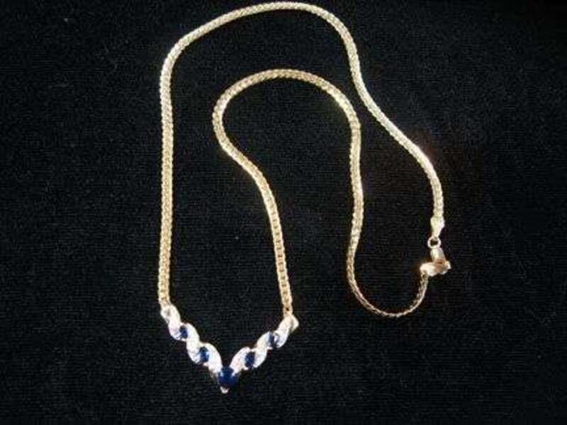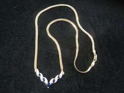 Flattened curb link necklace finishing in a sapphire and diamond pendant.