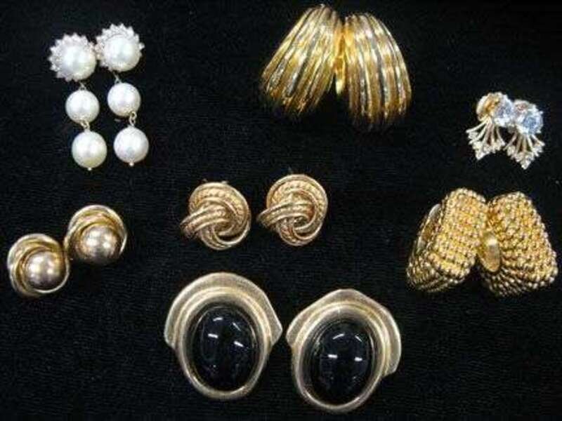 Of varying form, mostly plain yellow gold, one pair set as Cubic Zurconia studs, one pair cultured pearl, and one pair onyx disk earrings.