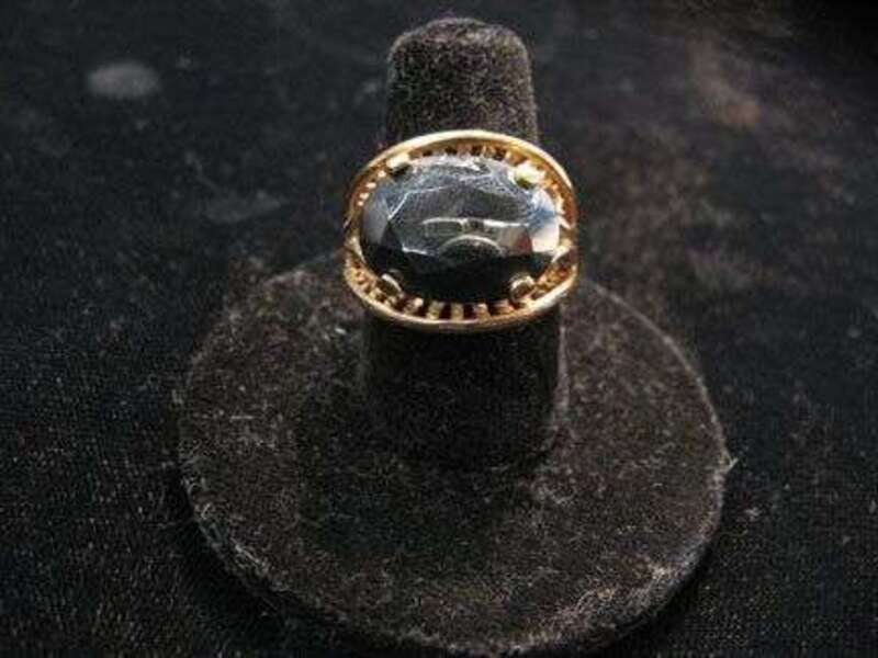 Large oval marcasite prong set in 14 karat yellow gold bombe setting.