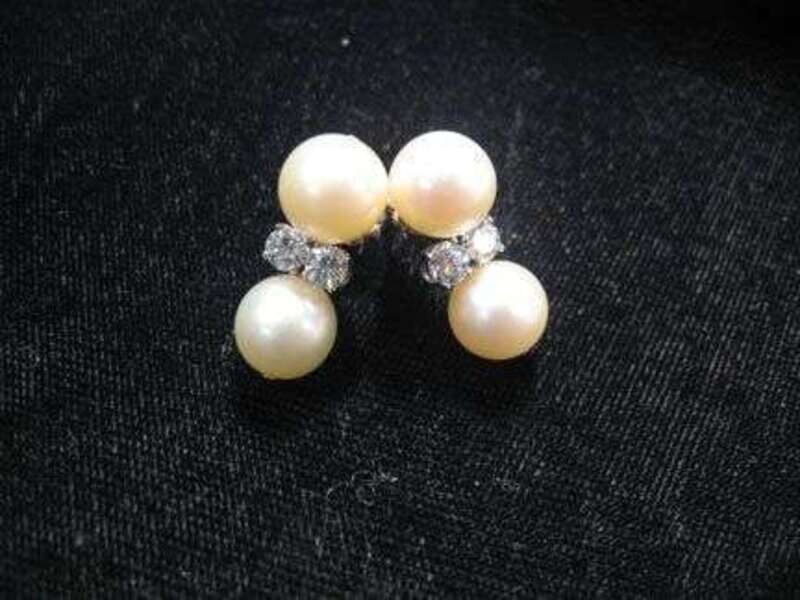 14 karat white gold set cultured pearls separated by two petite round cut diamonds, made for pierced ears.