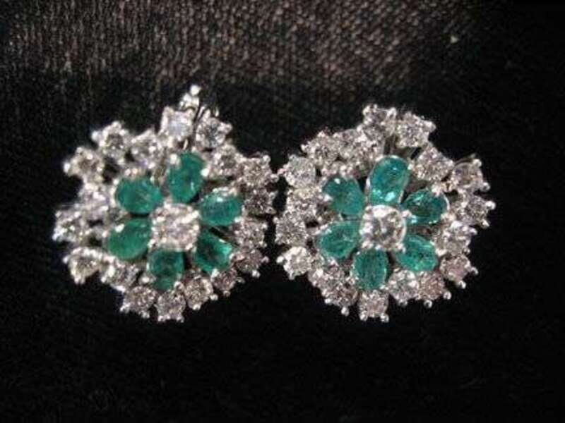 Flower cluster form earrings are set with nineteen petite round cut diamonds and six pear shaped emeralds, French backing of clip and post.