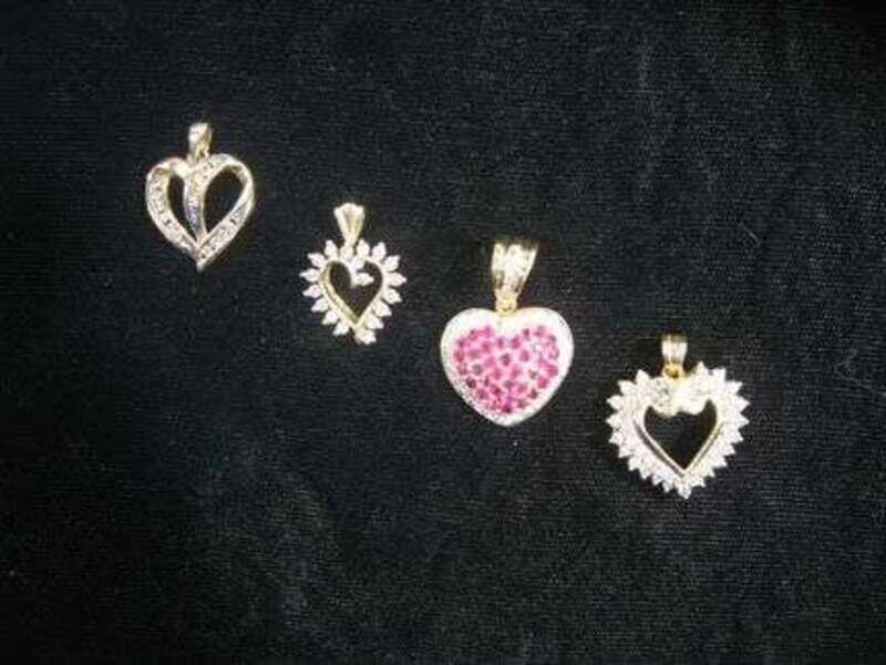 Group of four 14 karat yellow gold and diamond heart pendants
