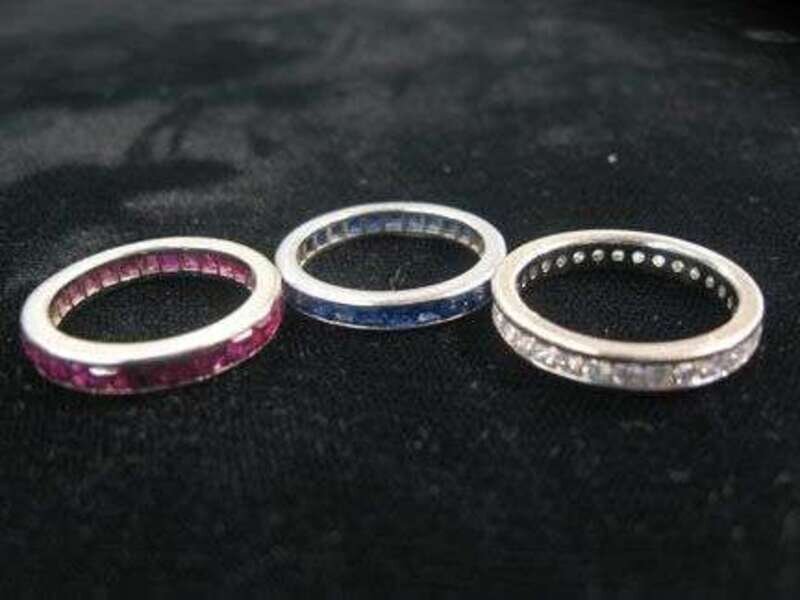 14 karat white and yellow gold eternity rings, on in ruby, one sapphire and one diamond.