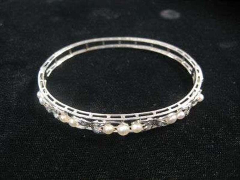 White gold seed pearl and diamond bangle bracelet